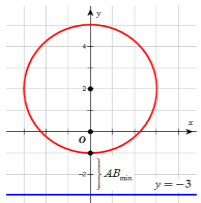 Dựa vào hình vẽ ta tìm được $A{B_{\min }} = 2$ khi \(A\left( {0; - 1} \right),{\rm{ }}B\left( {0; - 3} \right)\).