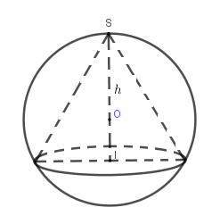 $\begin{array}{l}OI = \sqrt {{R^2} - {r^2}} \to h = \sqrt {{R^2} - {r^2}} + R\\V = \dfrac{1}{3}\pi {r^2}h = \dfrac{1}{3}\pi {r^2}(\sqrt {{R^2} - {r^2}} + R)\end{array}$