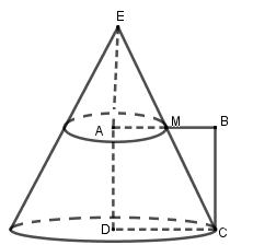 Kéo dài \(CM\) cắt \(DA\) tại \(E\). Quay hình thang vuông \(AMCD\) quanh trục \(AD\) ta được hình nón cụt như hình vẽ.