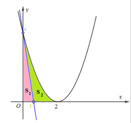 \(\Rightarrow {{S}_{1}}={{S}_{2}}\Rightarrow {{S}_{1}}=\frac{1}{2}\left( {{S}_{1}}+{{S}_{2}} \right)\Leftrightarrow \int\limits_{0}^{-\frac{4}{k}}{\left| kx+4 \right|dx}=\frac{1}{2}\int\limits_{0}^{2}{\left| {{x}^{2}}-4x+4 \right|dx}\Leftrightarrow \int\limits_{0}^{-\frac{4}{k}}{(kx+4)dx}=\frac{1}{2}\int\limits_{0}^{2}{{{(x-2)}^{2}}dx}\)