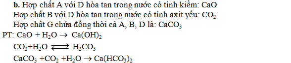 b. Hợp chất của A với D khi hoà tan trong nước cho dung dịch có tính kiềm. Hợp chất của B với D khi hoà tan trong nước cho dung dịch E có tính axit yếu. Hợp chất G chứa đồng thời cả A, B, D không tan trong nước nhưng tan trong dung dịch E. Xác định hợp chất tạo bởi A với D; B với D và G. Viết phương trình phản ứng.
