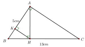 1. Cho tam giác ABC vuông tại A, đường cao AH, biết \( AB=5cm\) và \( BC=13cm\) . Từ H kẻ \( HK\) vuông góc với AB \( \left( K\in AB \right)\) . Tính AC, BH và \( \cos \angle HBK\) .