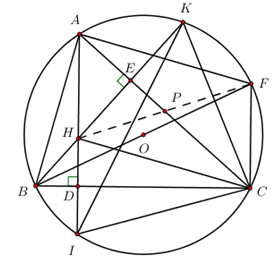 2. Cho tam giác ABC có ba góc nhọn nội tiếp đường tròn tâm O, các đường cao AD, BE cắt nhau tại H và cắt đường tròn (O) lần lượt tại I và K. (I khác A, K khác B)