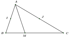 3) Cho tam giác \(ABC,\) gọi \(I,\,\,J\) lần lượt là trung điểm các cạnh \(AB\) và \(AC.\) Điểm \(M\) nằm trên cạnh \(BC\) sao cho \(MC = 2MB.\) Hãy phân tích vectơ \(\overrightarrow {AM} \) theo hai vectơ \(\overrightarrow {AI} ,\overrightarrow {AJ} .\)