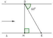 1. Một con thuyền ở địa điểm \(D\) di chuyển từ bờ sông \(a\) sang bờ sông \(b\) với vận tốc trung bình là \(2km/h,\) vượt qua khúc sông nước chảy mạnh trong \(20\) phút. Biết đường đi con thuyền là \(DE\), tạo với bờ sông một góc bằng \(60^\circ .\) Tính chiều rộng khúc sông.