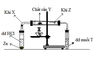 1. Tiến hành thí nghiệm như hình vẽ bên : cho viên kẽm vào dung dịch HCl thấy có khí X thoát ra; dẫn khí X đi qua chất rắn Y nung nóng thu được khí Z; sục khí Z vào dung dịch muối T thấy xuất hiện kết tủa màu đen.
