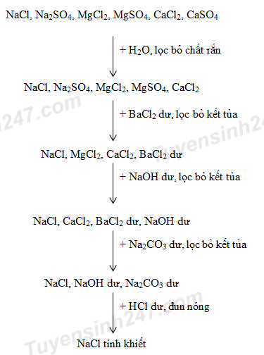 2. Muối ăn (NaCl) bị lẫn tạp chất: Na2SO4, MgCl2, MgSO4, CaCl2, CaSO4. Trình bày phương pháp hóa học loại bỏ các tạp chất để thu được NaCl tinh khiết. Viết các phương trình hóa học xảy ra.