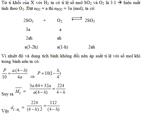 1. Trong một bình kín dung dịch không đổi chứa hỗn hợp X gồm SO2 và O2 ở 1500C, 10 atm (có mặt V2O5), tỉ khối X so với H2 là 28. Nung bình ở nhiệt độ 4000C trong một thời gian, sau đó đưa về nhiệt độ ban đầu thì thu được hỗn hợp Y, áp suất trong bình là P (atm). Tính P và tỉ khối của Y so với H2, biết hiệu suất của phản ứng là h.
