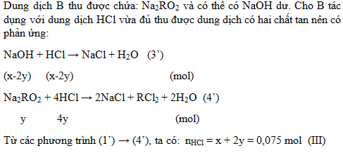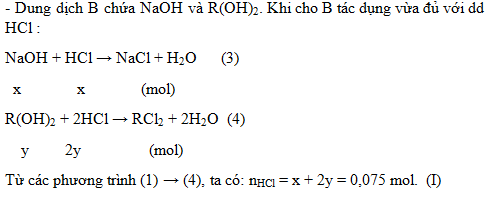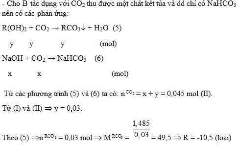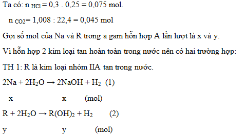 2. Hòa tan hết a gam hỗn hợp A gồm Na và một kim loại R có hóa trị II vào nước, phản ứng xong thu được dung dịch B và V lít khí H2. Nếu cho dung dịch B tác dụng vừa đủ với 300 ml dung dịch HCl 0,25M tạo thành một dung dịch chỉ chứa hai chất tan. Mặt khác, khi hấp thụ hết 1,008 lít khí CO2 vào dung dịch B thu được 1,485 gam một chất kết tủa và dung dịch nước lọc chỉ chứa chất tan NaHCO3. Biết các phản ứng xảy ra hoàn toàn và thể tích các khí đo ở điều kiện tiêu chuẩn. Hãy xác định tên kim loại R.