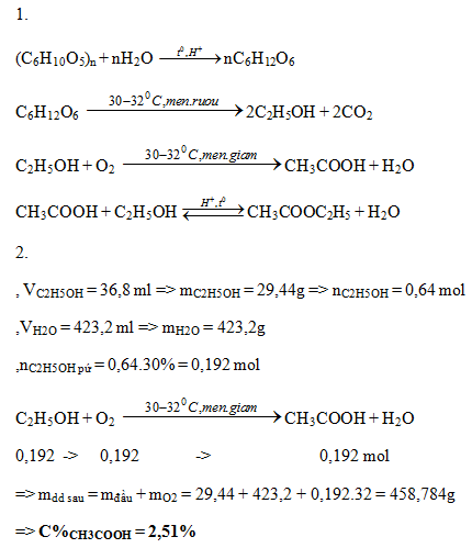 2. Tiến hành lên men giấm 460 ml rượu etylic 80 với hiệu suất 30%. Biết khối lượng riêng của rượu etylic là 0,8g/ml và của nước là 1g/ml. Hãy viết phương trình hóa học của phản ứng xảy ra và tính nồng độ phần trăm của axit axetic trong dung dịch thu được.