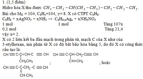 1. X là một hiđrocacbon. Hiđro hóa hoàn toàn X thì thu đuợc 3-etylhexan. Tỉ khối hơi của X so với Hiđro bằng 52. Nếu cho 10,4 gam X tác dụng hoàn toàn với lượng dư dung dịch bạc nitrat trong amoniac thì tạo được 31,8 gam một chất rắn có màu vàng nhạt. Lập công thức phân tử và viết các công thức cấu tạo có thể có của X.