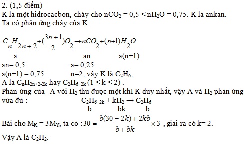2. Y là hỗn hợp gồm hidrocacbon CxHy (A) và H2. Sau khi đun nóng hỗn hợp Y với xúc tác Ni ta chỉ thu được một khí K duy nhất. Ở cùng điều kiện nhiệt độ và áp suất, tỷ khối của K so với H2 gấp ba lần tỷ khối hơi của Y so với H2. Mặt khác nếu đốt cháy hoàn toàn một lượng khác của K thu được 22 gam CO2 và 13,5 gam nước. Xác định công thức phân tử của A.