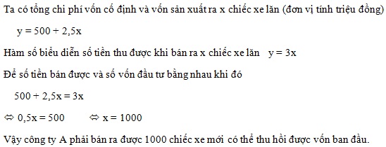 (1,0 điểm) Với sự phát triển của khoa học kĩ thuật hiện nay, người ta tạo ra nhiều mẫu xe lăn đẹp và tiện dụng cho người khuyết tật. Công ty A đã sản xuất ra những chiếc xe lăn cho người khuyết tật với số vốn ban đầu là 500 triệu đồng. Chi phí để sản xuất ra một chiếc xe lăn là 2 500 000 đồng. Giá bán ra mỗi chiếc là 3 000 000 đồng.