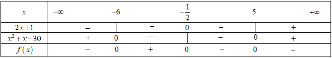 Đặt \(f\left( x \right) = \left( {2x + 1} \right)\left( {{x^2} + x - 30} \right)\) . Ta có bảng: