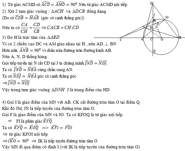 (3,5 điểm) Cho nửa đường tròn tâm O có đường kính AB. Lấy điểm C trên đoạn thẳng AO (C khác A, C khác O). Đường thẳng đi qua C và vuông góc với AB cắt nửa đường tròn tại K. Gọi M là điểm bất kì trên cung KB (M khác K, M khác B). Đường thẳng CK cắt các đường thẳng AM, BM lần lượt tại H và D. Đường thẳng BH cắt nửa đường tròn tại điểm thứ hai N.