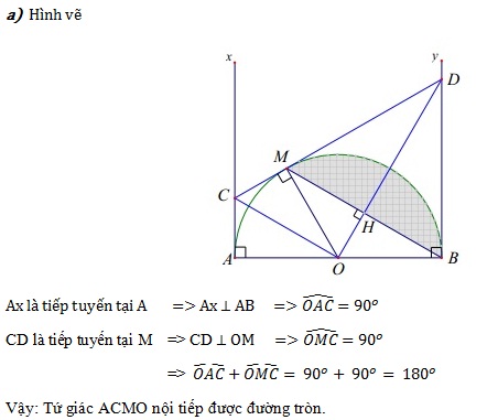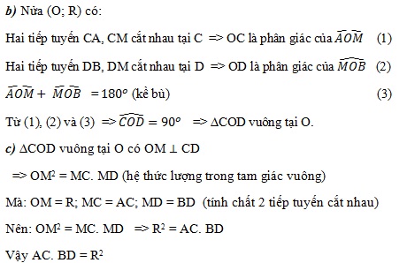 Cho nửa đường tròn (O;R), đường kính AB. Trên nửa mặt phẳng bờ AB chứa nửa đường tròn (O; R), vẽ các tiếp tuyến Ax, By với nửa đường tròn. Gọi M là điểm bất kì trên cung AB (M ≠ A; M ≠ B). Tiếp tuyến tại M với nửa đường tròn (O; R) cắt Ax, By lần lượt tại C và D.