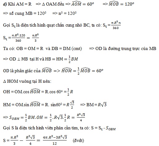 d) Trong trường hợp AM = R. Tính diện tích hình viên phân giới hạn bởi dây MB và cung MB của nửa đường tròn (O; R) theo R.