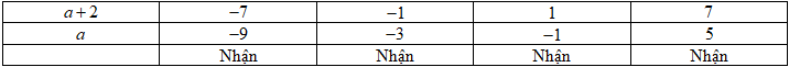 Theo bài ra có, \(a + 2 \in U\left( 7 \right) = \left\{ { \pm 1; \pm 7} \right\}\). Ta có bảng sau: