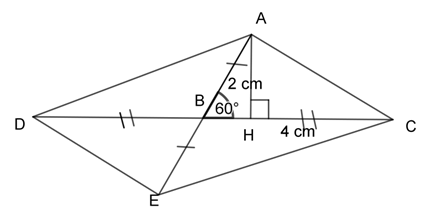 Vậy diện tích tứ giác ACED là: \({{S}_{AC\text{ED}}}=2.{{S}_{\Delta AC\text{D}}}=2.\frac{1}{2}.AH.DC=AH.2BC=\sqrt{3}.2.4=8\sqrt{3}\ c{{m}^{2}}\)