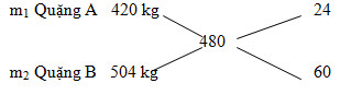 + Quặng B: \({m_B} = 1000.\frac{{69,6}}{{100}}.\frac{{168}}{{232}} = 504kg\)