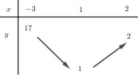 Từ BBT ta có: GTLN của hàm số trên \(\left[ { - 3;2} \right]\) là \(y = 17 \Leftrightarrow x = - 3\)