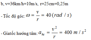 b) Một vành ngoài của bánh xe ô tô có bán kính là 25 cm. Tính tốc độ góc và gia tốc hướng tâm của 1 điểm trên vành ngoài của bánh xe khi ô tô đang chạy với tốc độ dài 36 km/h.