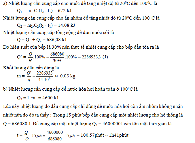 b) Cần đun thêm bao lâu nữa thì nước hóa hơi hoàn toàn. biét bếp dầu cung cấp nhiệt một cách đều đặn và kể từ lúc đun cho đến khi sôi mất thời gian là 15 phút. Biết nhiệt hóa hơi của nước là L = 2,3.106J/kg.