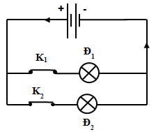 b) Để hai bóng có thể bật tắt riêng biệt cần 2 khóa K và 2 đèn cần phải mắc song song.