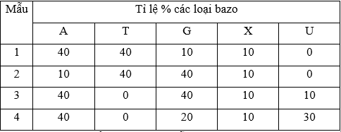 Axit nucleic có thể có dạng mạch kép (tx) hoặc dạng mạch đơn (xx). Bảng dưới đây cho thấy thành phần các bazo (nucleotit) của 4 mẫu nucleotit khác nhau