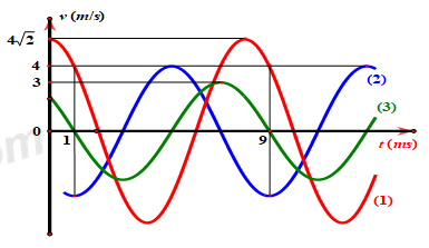 \(\begin{array}{l}{v_3} = 3\cos \left[ {250\pi \left( {t - 0,001} \right) + \dfrac{\pi }{2}} \right] = 3\cos \left( {250\pi t + \dfrac{\pi }{4}} \right)\,\,\left( {m/s} \right)\\ \Rightarrow {x_3} = \dfrac{3}{{250\pi }}\cos \left( {250\pi t - \dfrac{\pi }{4}} \right)\end{array}\)