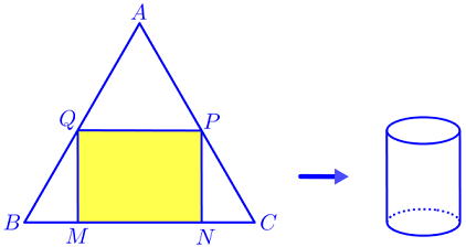 Bạn Bình muốn làm một chiếc thùng hình trụ không đáy từ nguyên liệu là mảnh tôn hình tam giác đều \(ABC\) có cạnh bằng \(60\left( {cm} \right)\). Bạn muốn cắt mảnh tôn hình chữ nhật \(MNPQ\) từ mảnh tôn nguyên liệu (với \(M,N\) thuộc cạnh \(BC\); \(P,Q\) tương ứng thuộc cạnh \(AC\) và \(AB\)) để tạo thành hình trụ có chiều cao bằng \(MQ\). Thể tích lớn nhất của chiếc thùng mà bạn Bình có thể làm được là:
