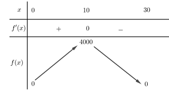 Từ BBT ta thấy \(\mathop {\max }\limits_{\left( {0;30} \right)} f\left( x \right) = f\left( {10} \right) = 4000\).