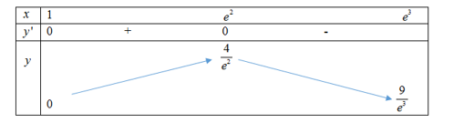 \(y = \frac{{{{\ln }^2}x}}{x} \Rightarrow y' = \frac{{2\ln x.\frac{1}{x}.x - 1.{{\ln }^2}x}}{{{x^2}}} = \frac{{2\ln x - {{\ln }^2}x}}{{{x^2}}};\,\,\,y' = 0 \Leftrightarrow \left[ \begin{array}{l}\ln x = 0\\\ln x = 2\end{array} \right. \Leftrightarrow \left[ \begin{array}{l}x = 1\\x = {e^2}\end{array} \right.\)