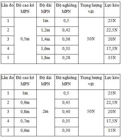 Gợi ý: Có thể sử dụng ngay từng bảng số liệu ở trên. trong đó có bổ sung thêm cột độ nghiêng của mặt phẳng nghiêng.