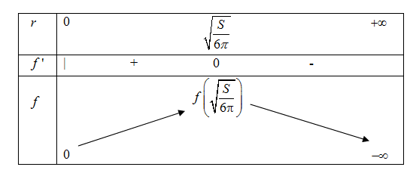 Xét hàm số \(f\left( r \right) = \frac{{Sr}}{2} - \pi {r^3},\,\,r > 0\) có: \(f'\left( r \right) = \frac{S}{2} - 3\pi {r^2} = 0 \Rightarrow r = \sqrt {\frac{S}{{6\pi }}} \)