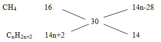 \(\frac{{C{H_4}}}{{{C_n}{H_{2n + 2}}}} = \frac{{14n - 28}}{{14}} = \frac{2}{1} \to 28 = 14n - 28 \to n = 4\)