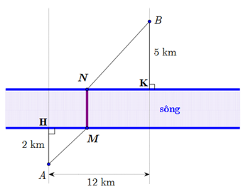 Hai thành phố A và B ngăn cách nhau bởi một còn sông. Người ta cần xây cây cầu bắc qua sông và vuông góc với bờ sông. Biết rằng thành phố A cách bờ sông 2 (km), thành phố B cách bờ sông 5 (km ), khoảng cách giữa đường thẳng đi qua A và đường thẳng đi qua B cùng vuông góc với bờ sông là 12 (km). Giả sử hai bờ sông là hai đường thẳng song song với nhau. Nhằm tiết kiệm chi phí đi từ thành phố A đến thành phố B, người ta xây cây cầu ở vị trí MN để quãng đường đi từ thành phố A đến thành phố B là ngắn nhất (hình vẽ). Khi đó, độ dài đoạn\(AM\) là