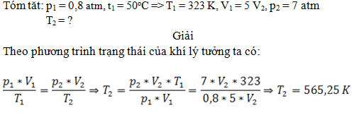 Chất khí trong xilanh của một động cơ nhiệt có áp suất 0,8 atm và nhiệt độ 50oC. Sau khi bị nén thể tích giảm đi 5 lần và áp suất tăng lên tới 7 atm. Tính nhiệt độ của khối khí cuối quá trình ?