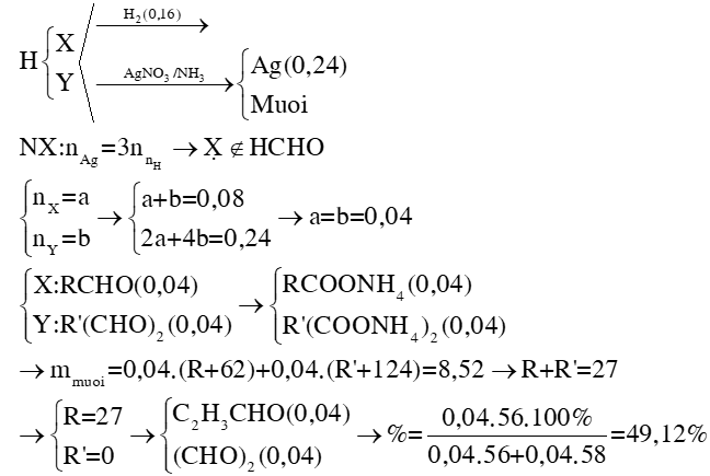 Chia 0,16 mol hỗn hợp H gồm hai anđehit đơn chức X và hai chức Y (MX < MY) thành hai phần bằng nhau. Hiđro hóa phần một cần vừa đúng 3,584 lít H2 (đktc). Cho phần hai tác dụng với một lượng dư dung dịch AgNO3/NH3 thu được 25,92 gam Ag và 8,52 gam hỗn hợp hai muối amoni của hai axit hữu cơ. Các phản ứng xảy ra hoàn toàn. Thành phần phần trăm khối lượng của X trong hỗn hợp H là