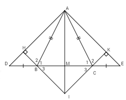 Cho \(\Delta ABC\) cân tại A. Trên tia đối của các tia BC và CB lấy theo thứ tự lần lượt 2 điểm D và E sao cho BD = CE.