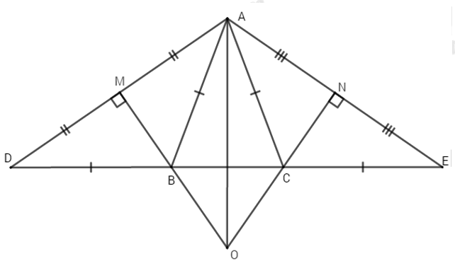 Cho \(\Delta ABC\) cân tại A. Trên tia đối của tia BC lấy điểm D sao cho \(BD=BA\) . Trên tia đối của tia CB lấy điểm E sao cho \(CE=CA\). Kẻ trung tuyến BM của \(\Delta ABD\), trung tuyến CN của \(\Delta ACE\), BM và CN cắt nhau tại O. Chứng minh AO vuông góc với DE.