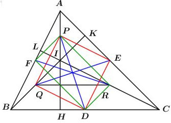 Cho \(\Delta ABC\) có 3 góc nhọn, đường cao AH, BK, CL cắt nhau tại I. Gọi D, E, F là trung điểm của BC, CA, AB. Gọi P, Q, R là trung điểm của IA, IB, IC.