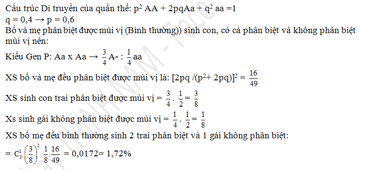 Cho biết ở người gen A quy định tính trạng phân biệt được mùi vị, alen a quy định không phân biệt được mùi vị. Nếu trong 1 cộng đồng người đang ở trạng thái cân bằng di truyền có tần số alen a = 0,4 thì xác suất của một cặp vợ chồng đều có kiểu hình phân biệt được mùi vị có thể sinh ra 3 con trong đó 2 con trai phân biệt được mùi vị và 1 con gái không phân biệt được mùi vị là?