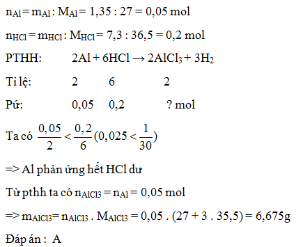 Cho 1,35g Al vào dung dịch chứa 7,3g HCl. Khối lượng muối nhôm tạo thành là