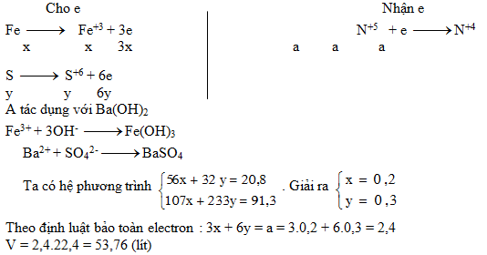 Cho 20,80 gam hỗn hợp Fe, FeS, FeS2, S tác dụng với dung dịch HNO3 đặc nóng dư thu được V lít khí NO2 (là sản phẩm khử duy nhất, đo ở đktc) và dung dịch A. Cho A tác dụng với dung dịch Ba(OH)2 dư thu được 91,30 gam kết tủa. Tính V?
