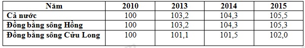 Căn cứ vào bảng số liệu cho biết nhận xét sau đây đúng về dân số trung bình của đồng bằng sông Hồng và đồng bằng sông Cửu Long giai đoạn 2010-2015?