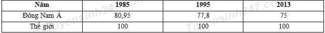 Nhận xét nào sau đây không đúng về tỉ trọng diện tích cao su của Đông Nam Á so với thế giới giai đoạn 1985 – 2013?