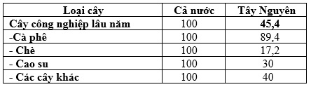 Bảng: Cơ cấu diện tích cây công nghiệp ở Tây Nguyên (đơn vị: %)