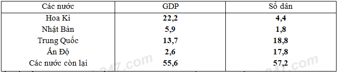 - GDP của Hoa Kì chiếm tỉ trọng cao nhất, chiếm 22,2%, bằng tổng GDP của 3 nước Nhật Bản, Trung Quốc, Ấn Độ cộng lại