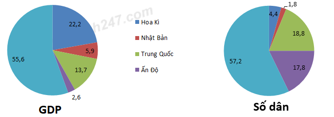 Biểu đồ thể hiện tỉ trọng GDP,số dân của Hoa Kì và một số nước trên thế giới năm 2014